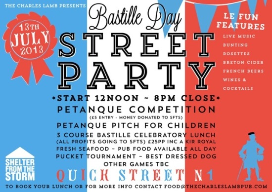 Our fabulous mes aimes at the Charles Lamb pub are throwing a Bastille day street party on 13 July to support the shelter and you’re all invited!